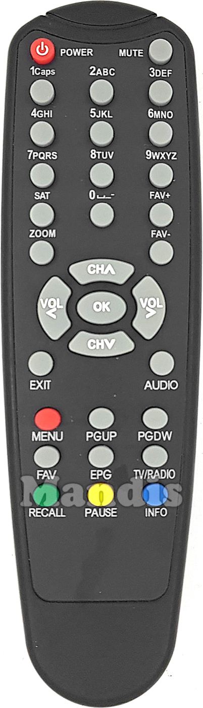 Power, Mute, 1, 2, 3, 4, 5, 6, 7, 8, 9, 0, Sat, Fav+, Fav-, Zoom, Up / CH+, Left / Vol-, OK, Right / Vol+, Down / CH-, Exit, Audio, Red / Menu, PGUP, PGDN, FAV, EPG, TV/Radio, Green / Recall, Yellow / Pause, Blue / Info