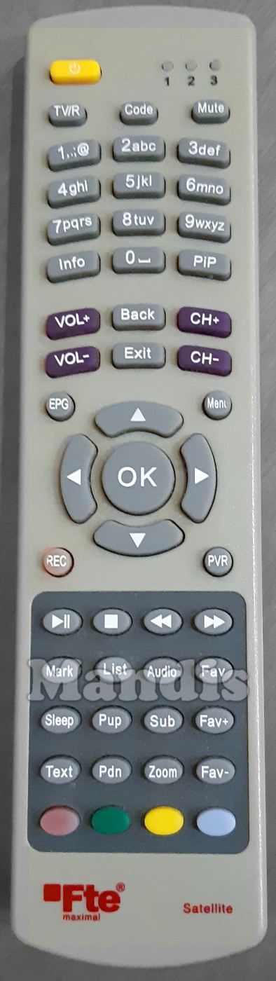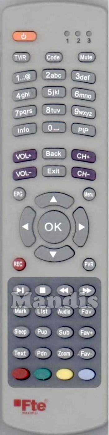 Power, TV/R, Code, Mute, 1, 2, 3, 4, 5, 6, 7, 8, 9, 0, Info, PiP, Vol+, Vol-, Back, Exit, CH+, CH-, EPG, Menu, Up, Left, OK, Right, Down, REC, PVR, Play / Pause, Stop, <<, >>, Mark, List, Audio, Fav, Sleep, Pup, Sub, Fav+, Text, Pdn, Zoom, Fav-, Red, Green, Yellow, Blue