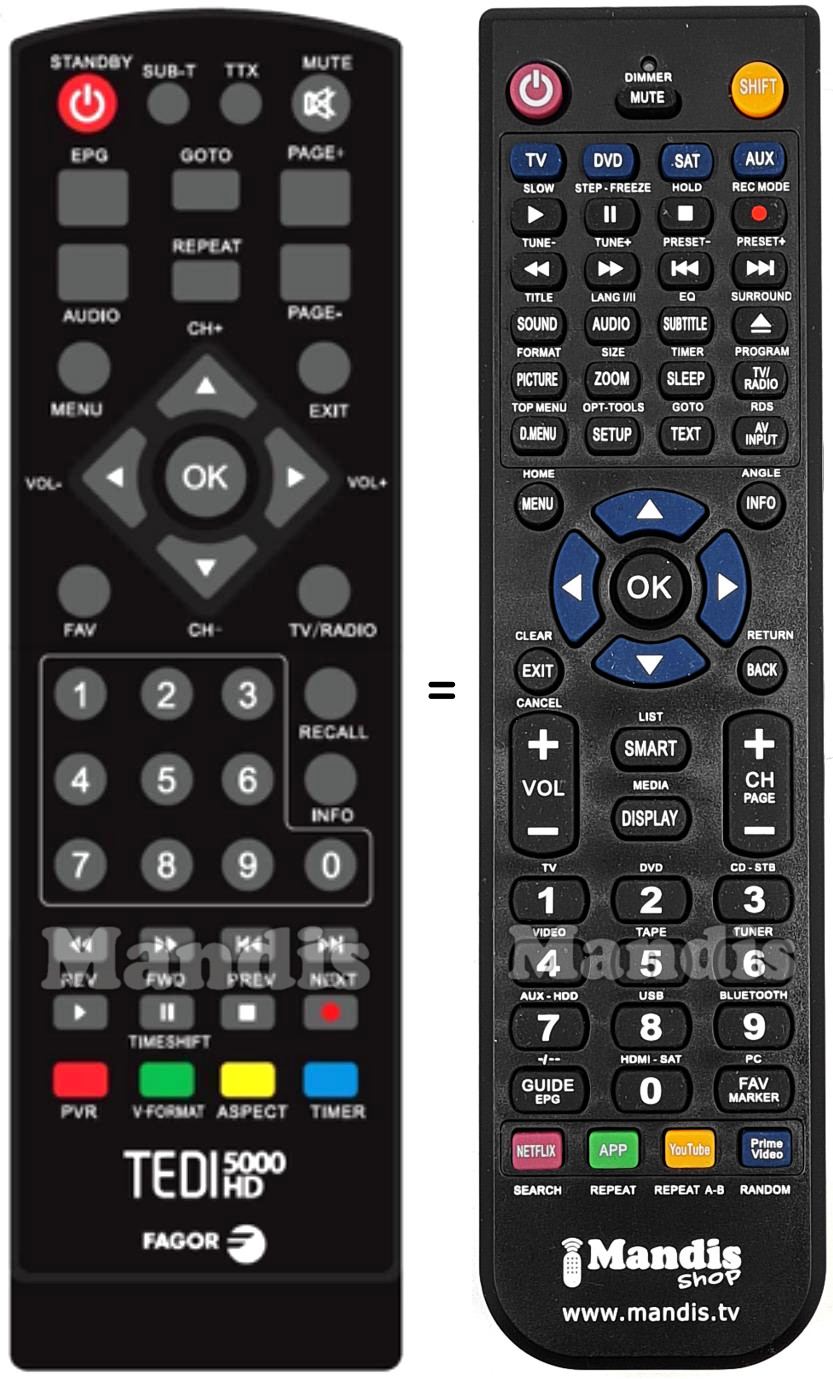Abaixo, mostraremos a correspondência entre cada botão no controle remoto original e o botão que executa a mesma função no controle remoto de substituição. Em alguns casos, pode ser necessário pressionar a tecla SHIFT antes de pressionar outro botão para realizar determinadas ações. Essas funções adicionais geralmente não são amplamente utilizadas e são incluídas para facilitar o entendimento do controle remoto de substituição, ou porque o controle remoto original tem mais botões do que seu equivalente.