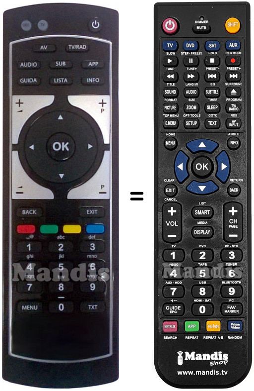 Abaixo, mostraremos a correspondência entre cada botão no controle remoto original e o botão que executa a mesma função no controle remoto de substituição. Em alguns casos, pode ser necessário pressionar a tecla SHIFT antes de pressionar outro botão para realizar determinadas ações. Essas funções adicionais geralmente não são amplamente utilizadas e são incluídas para facilitar o entendimento do controle remoto de substituição, ou porque o controle remoto original tem mais botões do que seu equivalente.