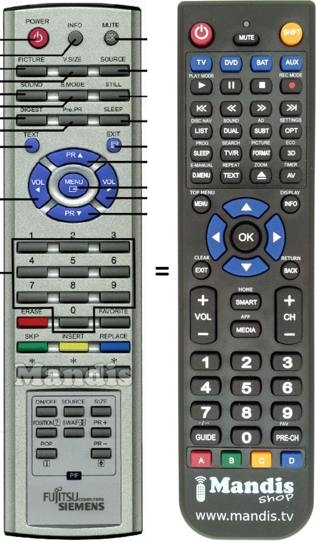 Este controle remoto executa todas as funções do controle remoto original: Power, Info, Mute, Picture, V.Size, Source, Sound, S.Mode, Still, Digest, Pre.PR, Sleep, Text, Exit, Up / PR+, Down / PR-, Right / Vol+, Left / Vol-, Menu, 1, 2, 3, 4, 5, 6, 7, 8, 9, 0, Favorite, Red / Erase, Green / Skip, Yellow / Insert, Blue / Replace, *, *, *, PIP On/Off, PIP Source, PIP Size, PIP Position, PIP Swap, PIP POP, PIP PR+, PIP PR-