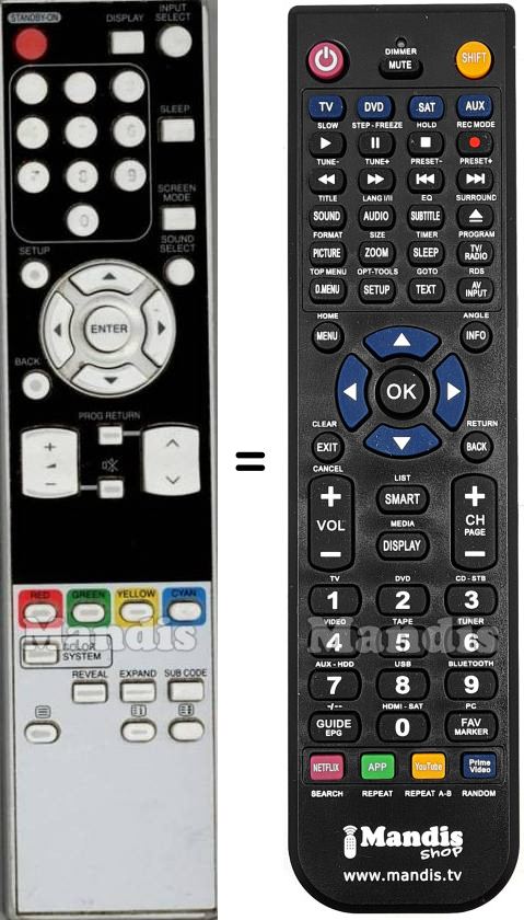Abaixo, mostraremos a correspondência entre cada botão no controle remoto original e o botão que executa a mesma função no controle remoto de substituição. Em alguns casos, pode ser necessário pressionar a tecla SHIFT antes de pressionar outro botão para realizar determinadas ações. Essas funções adicionais geralmente não são amplamente utilizadas e são incluídas para facilitar o entendimento do controle remoto de substituição, ou porque o controle remoto original tem mais botões do que seu equivalente.