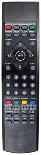 Power, Display, Nicam/A2, Mute, P Mode, S Mode, Sleep, Aspect, LCD Menu, DVD Menu, Up / CH +, Down / CH -, Right / Vol +, Left / Vol -, Enter, Source, Exit, 1, 2, 3, 4, 5, 6, 7, 8, 9, 0, Text, Hold, Red, Green, Yellow, Cyan, Index, Size, Reveal, Subpage, TV / Radio, Lang, Page -, Page +, Subtitle, EPG, FAV, Info
