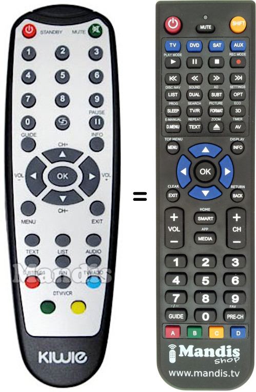 Este controle remoto executa todas as funções do controle remoto original: Standby, Mute, 1, 2, 3, 4, 5, 6, 7, 8, 9, 0, Recall, Pause, Guide, Info, Up / CH+, Down / CH-, Left / Vol-, Right / Vol+, OK, Menu, Exit, Text, List, Audio, Subtitle, P / N, TV / Radio, DTV / VCR, Red, Green, Yellow, Blue