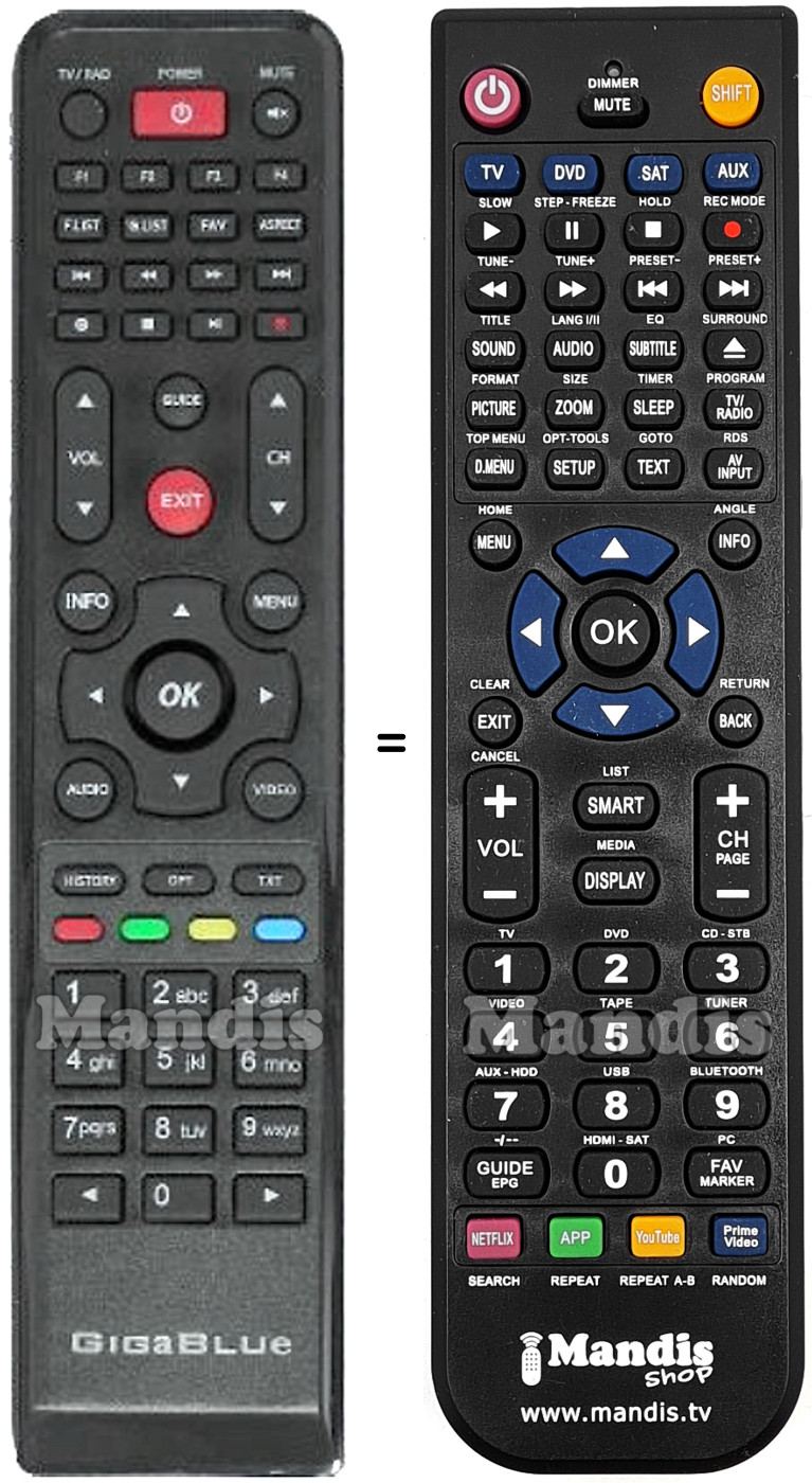 Abaixo, mostraremos a correspondência entre cada botão no controle remoto original e o botão que executa a mesma função no controle remoto de substituição. Em alguns casos, pode ser necessário pressionar a tecla SHIFT antes de pressionar outro botão para realizar determinadas ações. Essas funções adicionais geralmente não são amplamente utilizadas e são incluídas para facilitar o entendimento do controle remoto de substituição, ou porque o controle remoto original tem mais botões do que seu equivalente.