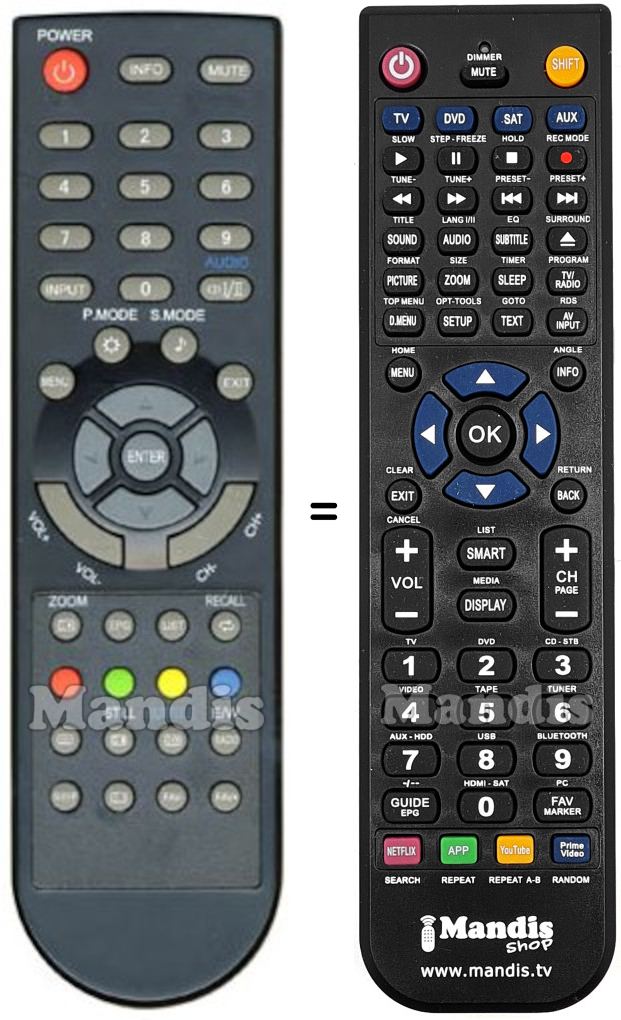 Abaixo, mostraremos a correspondência entre cada botão no controle remoto original e o botão que executa a mesma função no controle remoto de substituição. Em alguns casos, pode ser necessário pressionar a tecla SHIFT antes de pressionar outro botão para realizar determinadas ações. Essas funções adicionais geralmente não são amplamente utilizadas e são incluídas para facilitar o entendimento do controle remoto de substituição, ou porque o controle remoto original tem mais botões do que seu equivalente.