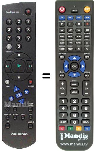 Atenção: este controle remoto equivalente substitui o controle remoto original. O controle original permite controlar uma TV Grundig e também possui dois códigos adicionais para controlar dois gravadores de vídeo (VCR). Para garantir a funcionalidade equivalente, o controle remoto equivalente também inclui três códigos. Ao pressionar o botão azul superior "TV", seleciona-se o código para controlar a TV Grundig. Ao pressionar os botões azuis superiores "DVD" e/ou "SAT", seleciona-se o código para controlar cada um dos dois gravadores de vídeo (VCR), também da marca Grundig.
