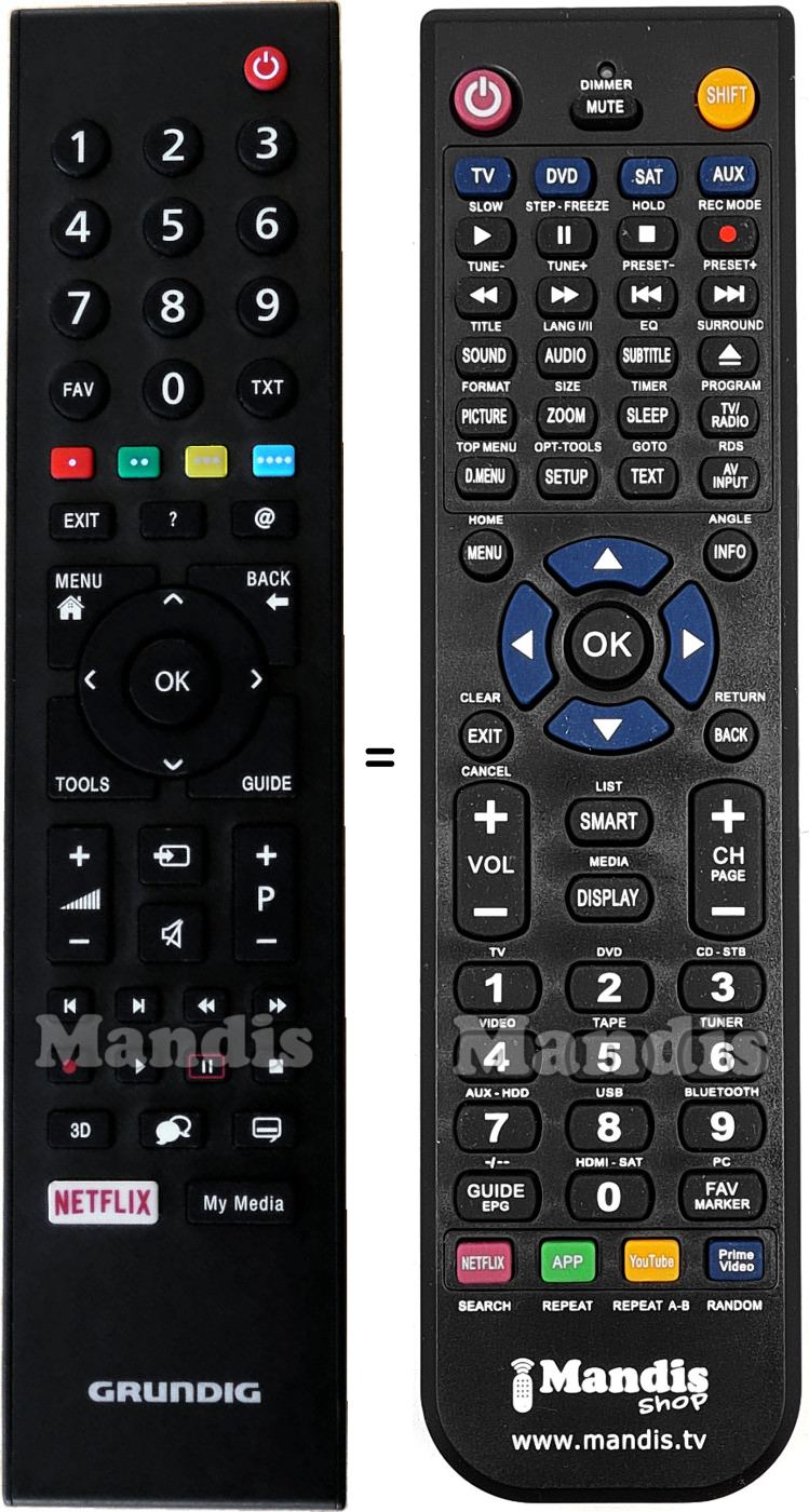 Este controle remoto executa todas as funções do controle remoto original: Power, 1, 2, 3, 4, 5, 6, 7, 8, 9, 0, Fav, Txt, Red, Green, Yellow, Blue, Exit, ?, @, Menu, Back, Up, Right, Down, Left, OK, Tools, Guide, Vol +, Vol -, Input, Mute, P +, P -, I<, >I, <<, >>, Rec, Play, Pause, Stop, 3D, Lang, Subtitle, Netflix, My Media