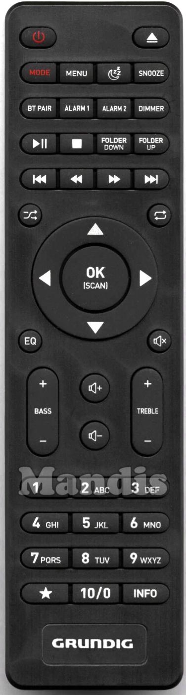 Power, Open / Close, Mode, Menu, Sleep, Snooze, BT Pair, Alarm 1, Alarm 2, Dimmer, Play / Pause, Stop, Folder Down, Folder Up, I<<, <<, >>, >>I, Random, Repeat, Up, Left, OK (Scan), Right, Down, EQ, Mute, Bass+, Bass-, Vol+, Vol-, Treble+, Treble-, 1, 2, 3, 4, 5, 6, 7, 8, 9, 10/0, *, Info