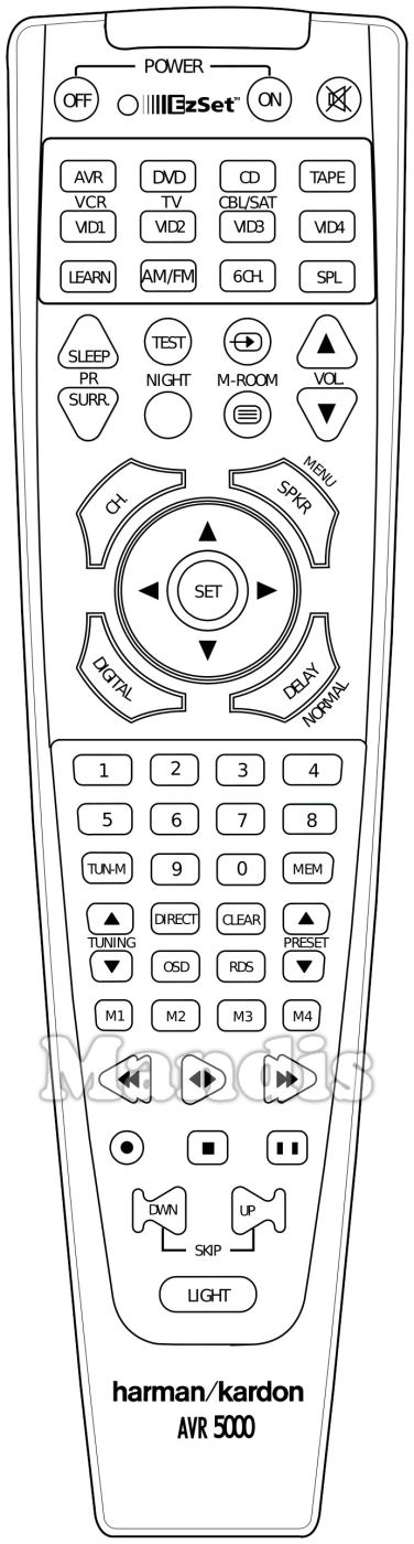 Power Off, Power On, Mute, AVR, DVD, CD, TAPE, VID1 / VCR, VID2 / TV, VID3 / CBL/SAT, VID4, LEARN, AM/FM, 6CH, SPL, Sleep / CH+, Surr. / CH-, Test, Night, Input, M-Room, Vol+, Vol-, CH / Guide, SPKR / Menu, Digital / Exit, Delay / Normal, Up, Left, Set, Right, Down, 1, 2, 3, 4, 5, 6, 7, 8, 9, 0, Tun-M, Mem, Tuning+, Tuning-, Direct, Clear, Preset+, Preset-, OSD, RDS, M1, M2, M3, M4, <<, Play, >>, Rec, Stop, Pause, Skip Dwn, Skip Up, Light