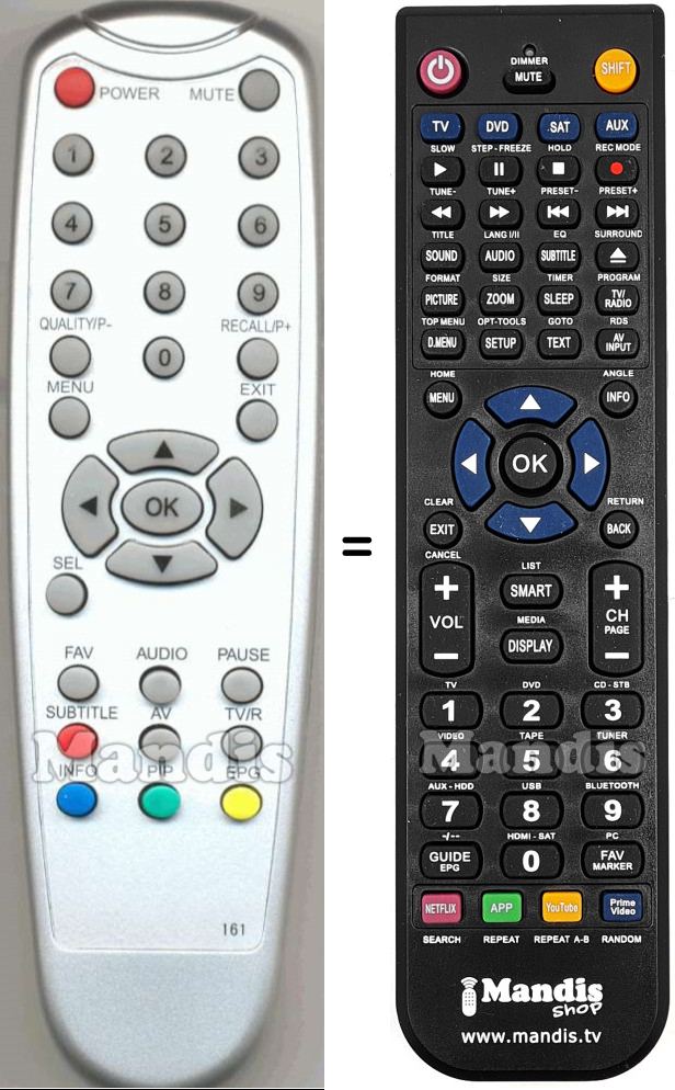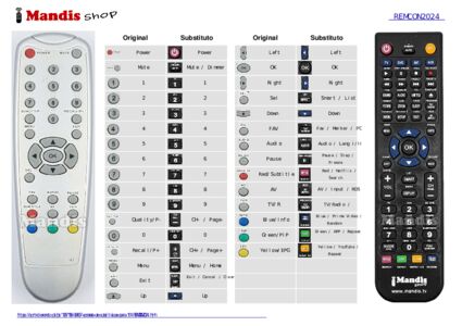 Abaixo, mostraremos a correspondência entre cada botão no controle remoto original e o botão que executa a mesma função no controle remoto de substituição. Em alguns casos, pode ser necessário pressionar a tecla SHIFT antes de pressionar outro botão para realizar determinadas ações. Essas funções adicionais geralmente não são amplamente utilizadas e são incluídas para facilitar o entendimento do controle remoto de substituição, ou porque o controle remoto original tem mais botões do que seu equivalente.