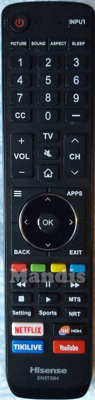 Comando à distância original EN3T39H da marca Hisense. Trata-se de um modelo original de comando à distância.