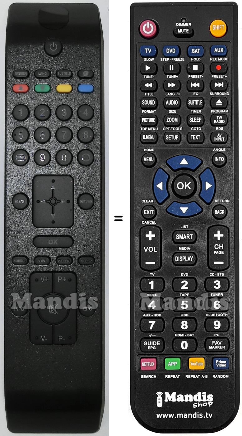 Abaixo, mostraremos a correspondência entre cada botão no controle remoto original e o botão que executa a mesma função no controle remoto de substituição. Em alguns casos, pode ser necessário pressionar a tecla SHIFT antes de pressionar outro botão para realizar determinadas ações. Essas funções adicionais geralmente não são amplamente utilizadas e são incluídas para facilitar o entendimento do controle remoto de substituição, ou porque o controle remoto original tem mais botões do que seu equivalente.
