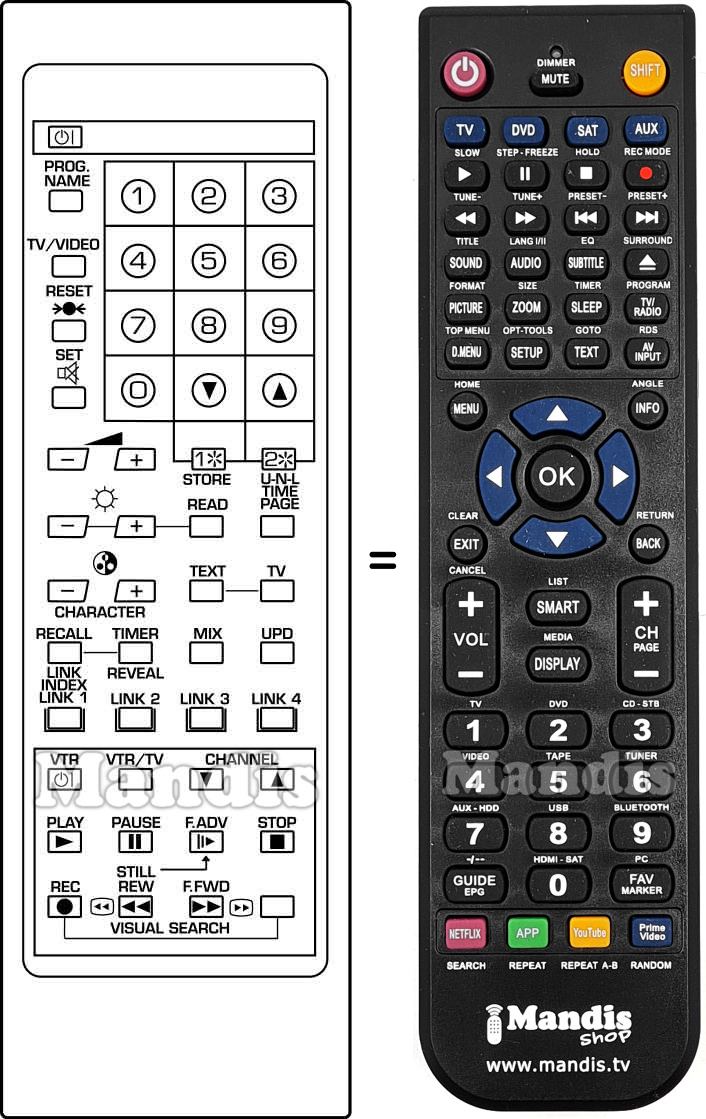 Abaixo, mostraremos a correspondência entre cada botão no controle remoto original e o botão que executa a mesma função no controle remoto de substituição. Em alguns casos, pode ser necessário pressionar a tecla SHIFT antes de pressionar outro botão para realizar determinadas ações. Essas funções adicionais geralmente não são amplamente utilizadas e são incluídas para facilitar o entendimento do controle remoto de substituição, ou porque o controle remoto original tem mais botões do que seu equivalente.