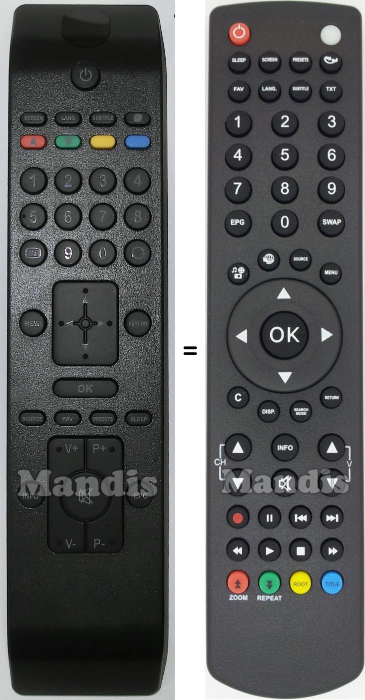 Power, Sleep, Screen, Presets, ↔, FAV, Lang, Subtitle, TXT, 1, 2, 3, 4, 5, 6, 7, 8, 9, 0, EPG, Swap, Photo/Music/Movie, World, Source, Menu, OK, Up, Down, Right, Left, C, Disp., Search Mode, Return, CH+, CH-, Vol+, Vol-, Info, Mute, Rec, Pause, I<<, >>I, <<, Play, Stop, >>, Red/↑/Zoom, Green/↓/Repeat, Yellow/Root, Blue/Title
