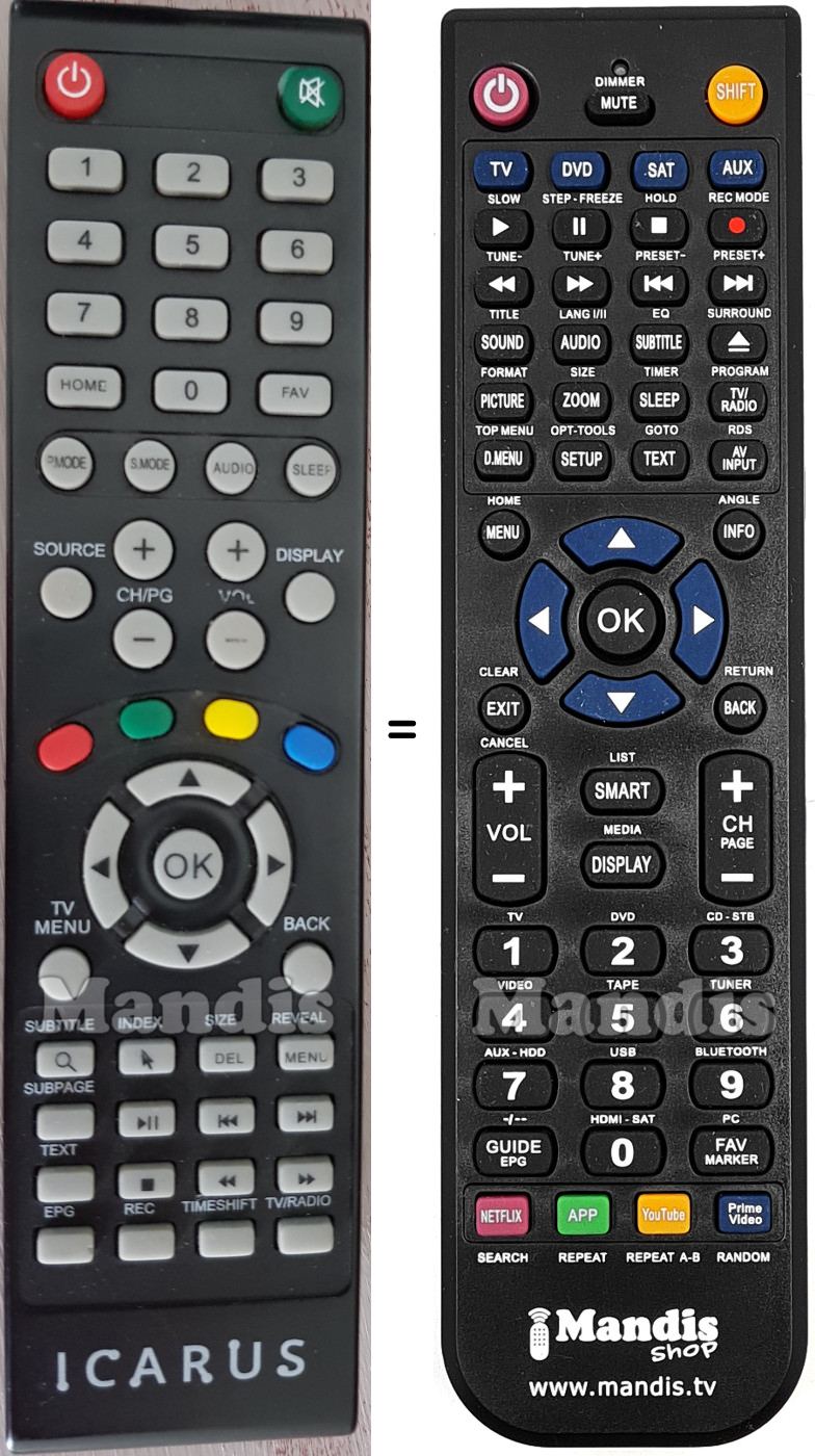 Abaixo, mostraremos a correspondência entre cada botão no controle remoto original e o botão que executa a mesma função no controle remoto de substituição. Em alguns casos, pode ser necessário pressionar a tecla SHIFT antes de pressionar outro botão para realizar determinadas ações. Essas funções adicionais geralmente não são amplamente utilizadas e são incluídas para facilitar o entendimento do controle remoto de substituição, ou porque o controle remoto original tem mais botões do que seu equivalente.