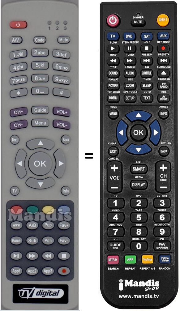 Comando à distância que substitui o original RCU 018 em todas as suas funções.