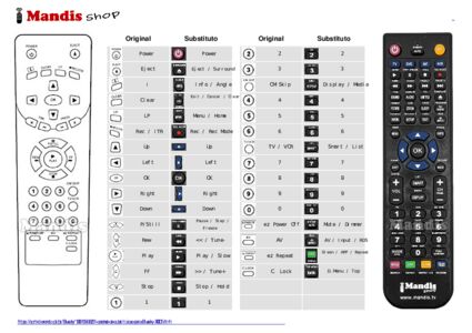 Abaixo, mostraremos a correspondência entre cada botão no controle remoto original e o botão que executa a mesma função no controle remoto de substituição. Em alguns casos, pode ser necessário pressionar a tecla SHIFT antes de pressionar outro botão para realizar determinadas ações. Essas funções adicionais geralmente não são amplamente utilizadas e são incluídas para facilitar o entendimento do controle remoto de substituição, ou porque o controle remoto original tem mais botões do que seu equivalente.