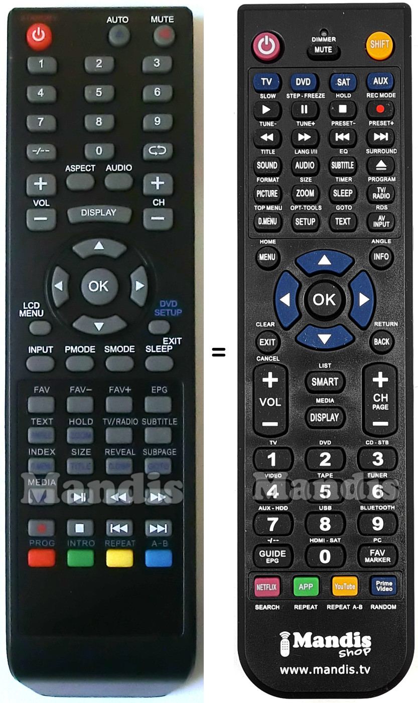 Abaixo, mostraremos a correspondência entre cada botão no controle remoto original e o botão que executa a mesma função no controle remoto de substituição. Em alguns casos, pode ser necessário pressionar a tecla SHIFT antes de pressionar outro botão para realizar determinadas ações. Essas funções adicionais geralmente não são amplamente utilizadas e são incluídas para facilitar o entendimento do controle remoto de substituição, ou porque o controle remoto original tem mais botões do que seu equivalente.