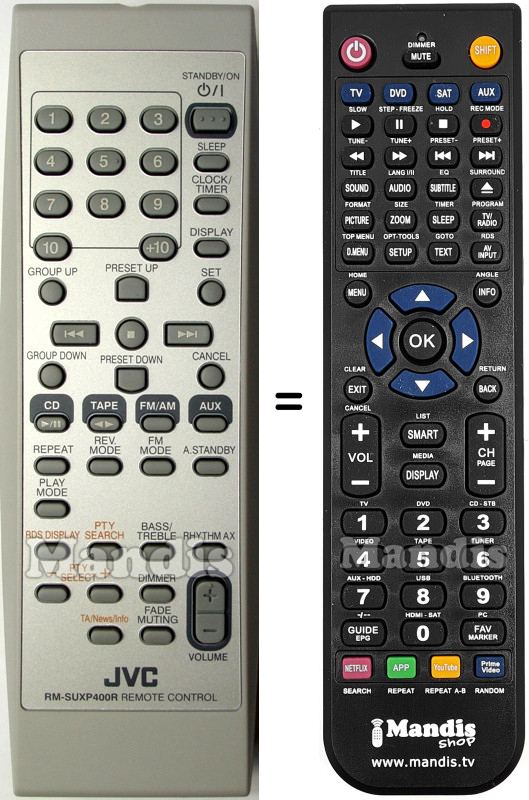 Abaixo, mostraremos a correspondência entre cada botão no controle remoto original e o botão que executa a mesma função no controle remoto de substituição. Em alguns casos, pode ser necessário pressionar a tecla SHIFT antes de pressionar outro botão para realizar determinadas ações. Essas funções adicionais geralmente não são amplamente utilizadas e são incluídas para facilitar o entendimento do controle remoto de substituição, ou porque o controle remoto original tem mais botões do que seu equivalente.
