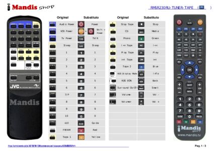 Este controle remoto executa todas as funções do controle remoto original: Audio Power, VCR Power, TV Power, Sleep, 1, 2, 3, 4, 5, 6, 7 / P, 8, 9, 10, +10, CD-Disc, FM/AM, PHONO, TAPE2, TAPE1, CD, Stop, I<<, Play, >>I, RDS Display Mode, RDS EON, Surround On/Off, Volume-, Volume+