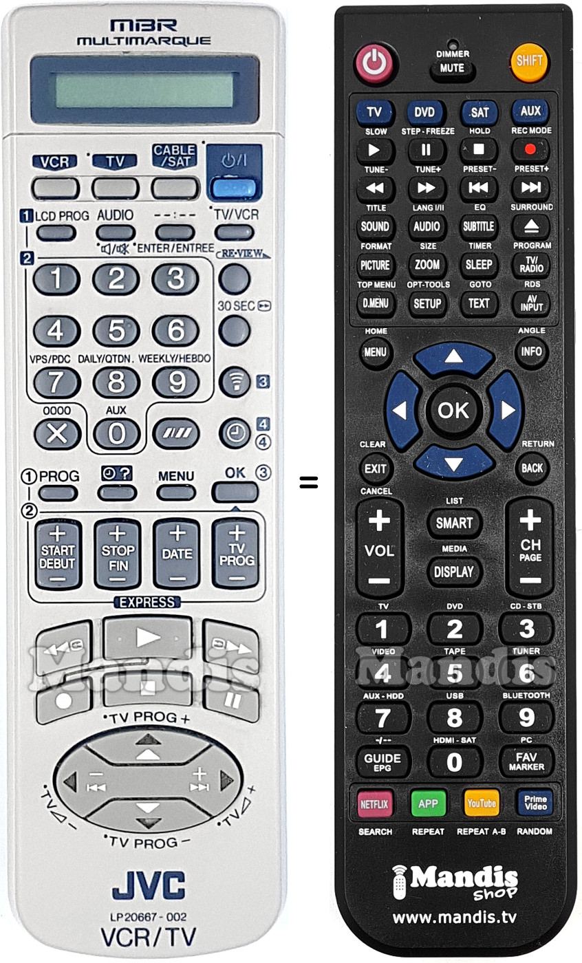 Abaixo, mostraremos a correspondência entre cada botão no controle remoto original e o botão que executa a mesma função no controle remoto de substituição. Em alguns casos, pode ser necessário pressionar a tecla SHIFT antes de pressionar outro botão para realizar determinadas ações. Essas funções adicionais geralmente não são amplamente utilizadas e são incluídas para facilitar o entendimento do controle remoto de substituição, ou porque o controle remoto original tem mais botões do que seu equivalente.