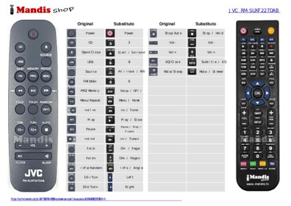 Abaixo, mostraremos a correspondência entre cada botão no controle remoto original e o botão que executa a mesma função no controle remoto de substituição. Em alguns casos, pode ser necessário pressionar a tecla SHIFT antes de pressionar outro botão para realizar determinadas ações. Essas funções adicionais geralmente não são amplamente utilizadas e são incluídas para facilitar o entendimento do controle remoto de substituição, ou porque o controle remoto original tem mais botões do que seu equivalente.
