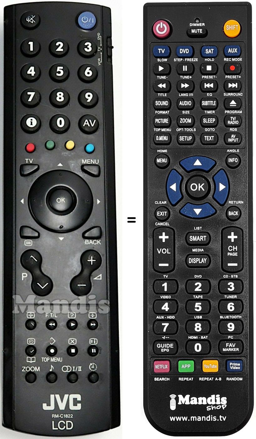 Comando à distância que substitui o original RM-C1822 (RMC1822B1C) em todas as suas funções.