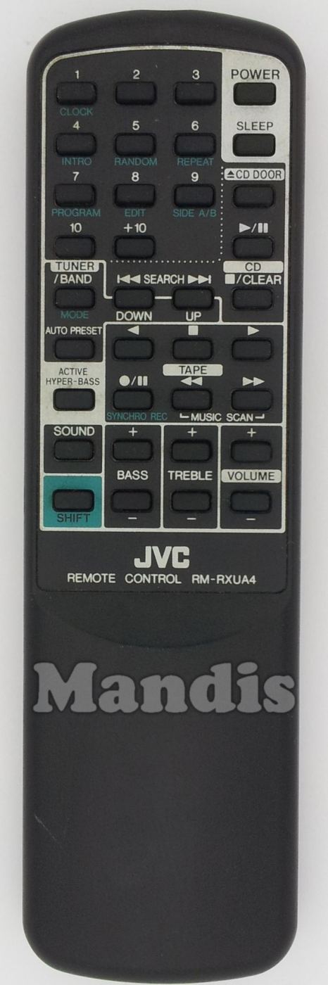 Comando à distância original RM-RXUA4 que serve para sistemas hi-fi e receivers av da marca JVC. Trata-se de um modelo original de comando à distância.