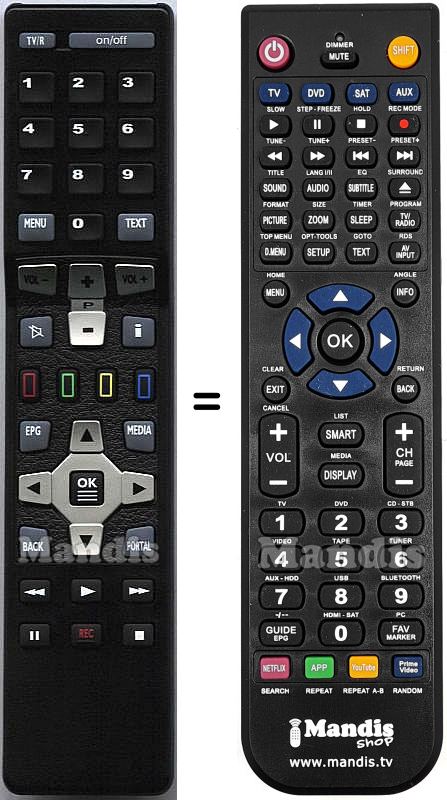 Abaixo, mostraremos a correspondência entre cada botão no controle remoto original e o botão que executa a mesma função no controle remoto de substituição. Em alguns casos, pode ser necessário pressionar a tecla SHIFT antes de pressionar outro botão para realizar determinadas ações. Essas funções adicionais geralmente não são amplamente utilizadas e são incluídas para facilitar o entendimento do controle remoto de substituição, ou porque o controle remoto original tem mais botões do que seu equivalente.