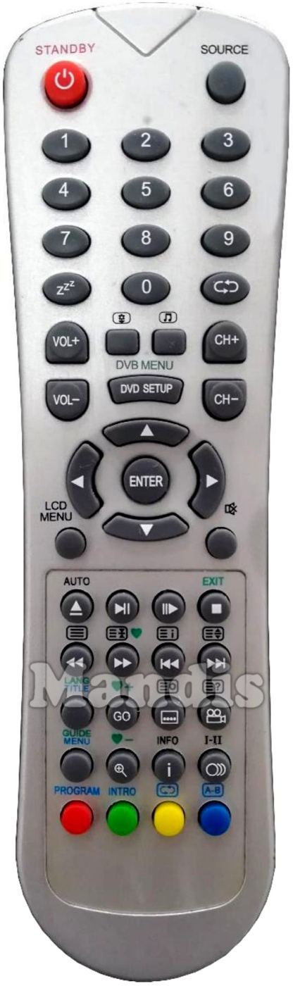Standby, Source, 1, 2, 3, 4, 5, 6, 7, 8, 9, 0, ZZZ, Recall, Vol +, Vol -, Picture, Audio, DVD Setup / DVB Menu, CH +, CH -, Up, Right, Down, Left, Enter, LCD Menu, Mute, Eject / Auto, Play / Pause, II>, Stop / Exit, << / Text, >> / Hold / FAV, I<< / Index, >>I / Size, Title / Lang, Go / Fav +, Subtitle / [=o], Angle / [=?], Menu / Guide, Zoom / Fav -, Info, Audio I-II, Red / Program, Green / Intro, Yellow / Recall, Blue / A-B
