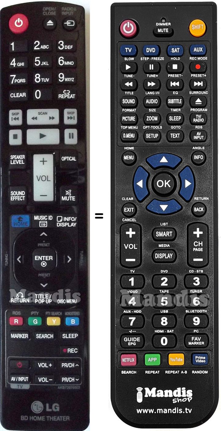 Este controle remoto executa todas as funções do controle remoto original: Power, Open/Close, Radio/Input, 1, 2, 3, 4, 5, 6, 7, 8, 9, 0, Clear, Repeat, I<< Skip, Skip >>I, Stop, Pause, << Scan, Scan >>, Play, Speaker Level, Optical, Sound Effect, Mute, Vol+, Vol-, Home, Music ID, Info/Display, Return, Title/PopUp, Disc Menu, Enter, Up/Preset+, Down/Preset-, Right/Tuning+, Left/Tuning-, Red/RDS, Green/PTY, Yellow/PTY Search, Blue/Mono/Stereo, Marker, Search, Sleep, Rec, Power TV, AV Input Tv, Vol+ Tv, Vol- Tv, PR/CH+ Tv, PR/CH- Tv