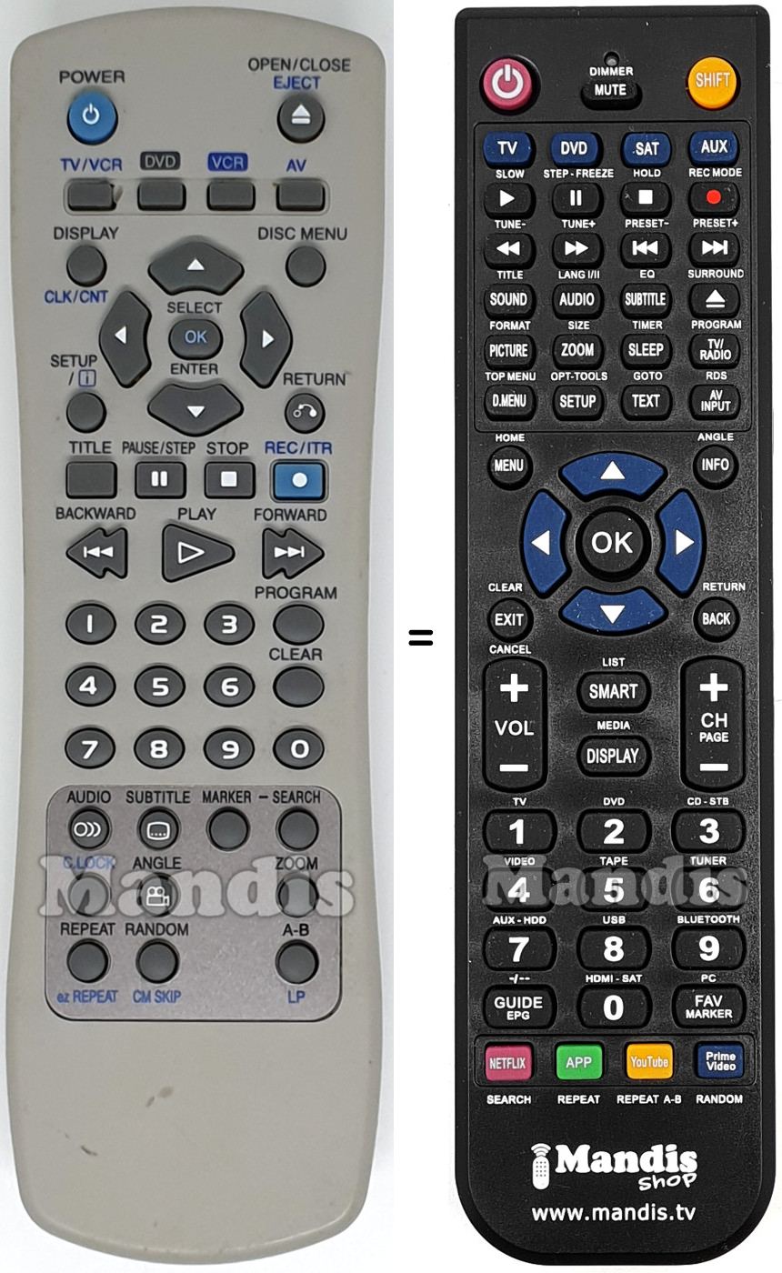 Abaixo, mostraremos a correspondência entre cada botão no controle remoto original e o botão que executa a mesma função no controle remoto de substituição. Em alguns casos, pode ser necessário pressionar a tecla SHIFT antes de pressionar outro botão para realizar determinadas ações. Essas funções adicionais geralmente não são amplamente utilizadas e são incluídas para facilitar o entendimento do controle remoto de substituição, ou porque o controle remoto original tem mais botões do que seu equivalente.