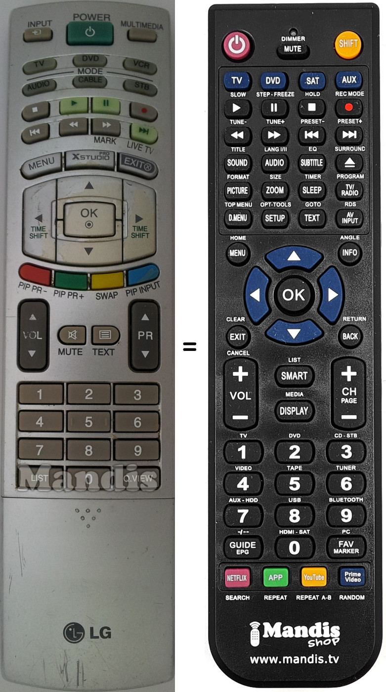 Comando à distância que substitui o original AKB30588001 em todas as suas funções. Não se trata de um comando universal, mas sim de um comando que substitui o original. Receberá um comando completamente pronto. Para fazê-lo funcionar, basta colocar as pilhas. Não é necessário programá-lo. Damos-lhe total garantia de que o comando cumprirá com as mesmas funções do comando original.