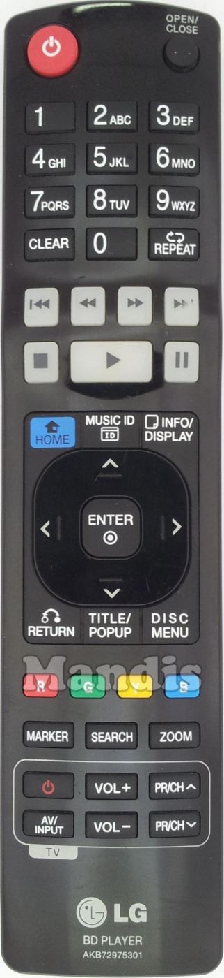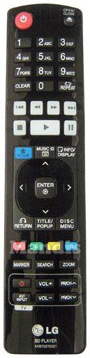 Power, Open/Close, 1, 2, 3, 4, 5, 6, 7, 8, 9, 0, Clear, Repeat, I<<, <<, >>, >>I, Stop, Pause, Play, Home, Music ID, Info/Display, Return, Title/Popup, Menu Disc, Up, Down, Right, Left, Enter, Red, Green, Yellow, Blue, Marker, Search, Zoom, Power Tv, AV Input Tv, Vol+ Tv, Vol- Tv, PR/CH+ Tv, PR/CH- Tv
