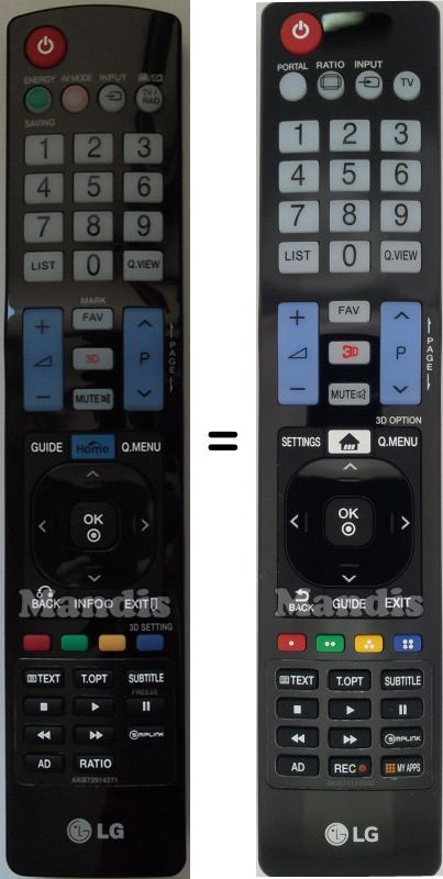 Power, Portal/Energy Saving, Ratio, Input, TV, 1, 2, 3, 4, 5, 6, 7, 8, 9, 0, List, Q.View, FAV, 3D, Mute, Vol+, Vol-, P+, P-, Settings, Home/Info, Q.Menu/3D Option, Back, Guide, Exit, Up, Down, OK, Left, Right, Red, Green, Yellow, Blue, Text, T.Opt, Subtitle, Stop, Play, Pause, <<, >>, Simplink, AD, Rec, My APPS