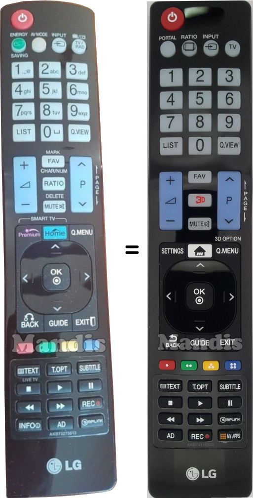 Power, Portal/Energy Saving, Ratio, Input, TV, 1, 2, 3, 4, 5, 6, 7, 8, 9, 0, List, Q.View, FAV, 3D, Mute, Vol+, Vol-, P+, P-, Settings, Home/Info, Q.Menu/3D Option, Back, Guide, Exit, Up, Down, OK, Left, Right, Red, Green, Yellow, Blue, Text, T.Opt, Subtitle, Stop, Play, Pause, <<, >>, Simplink, AD, Rec, My APPS