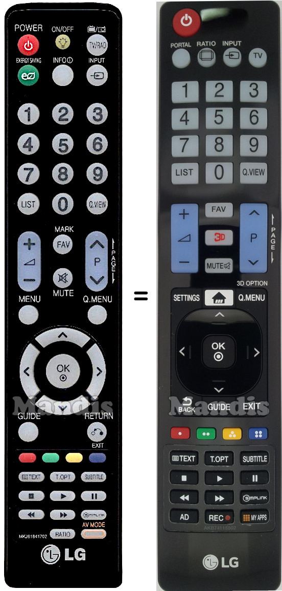 Power, Portal/Energy Saving, Ratio, Input, TV, 1, 2, 3, 4, 5, 6, 7, 8, 9, 0, List, Q.View, FAV, 3D, Mute, Vol+, Vol-, P+, P-, Settings, Home/Info, Q.Menu/3D Option, Back, Guide, Exit, Up, Down, OK, Left, Right, Red, Green, Yellow, Blue, Text, T.Opt, Subtitle, Stop, Play, Pause, <<, >>, Simplink, AD, Rec, My APPS