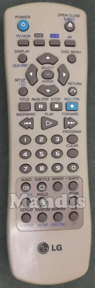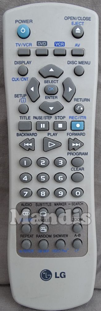 Power, Open/Close / Eject, TV / VCR, DVD, VCR, AV, Display / CLK/CNT, Disc Menu, Up, Down, Right, Left, Setup / [i], Return, OK / Select / Enter, Title, Pause / Step, Stop, Rec / ITR, Backward, Play, Forward, 1, 2, 3, 4, 5, 6, 7, 8, 9, 0, Clear, Program, Audio, Subtitle, Marker, Search, C.Lock, Angle, Zoom, Repeat / ez Repeat, Random / CM Skip, Showview / VIDEO Plus*, A-B / LP