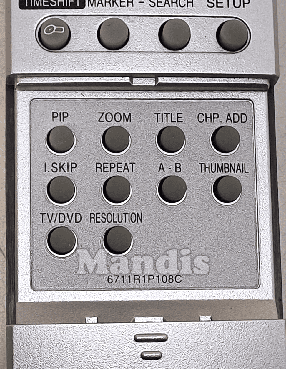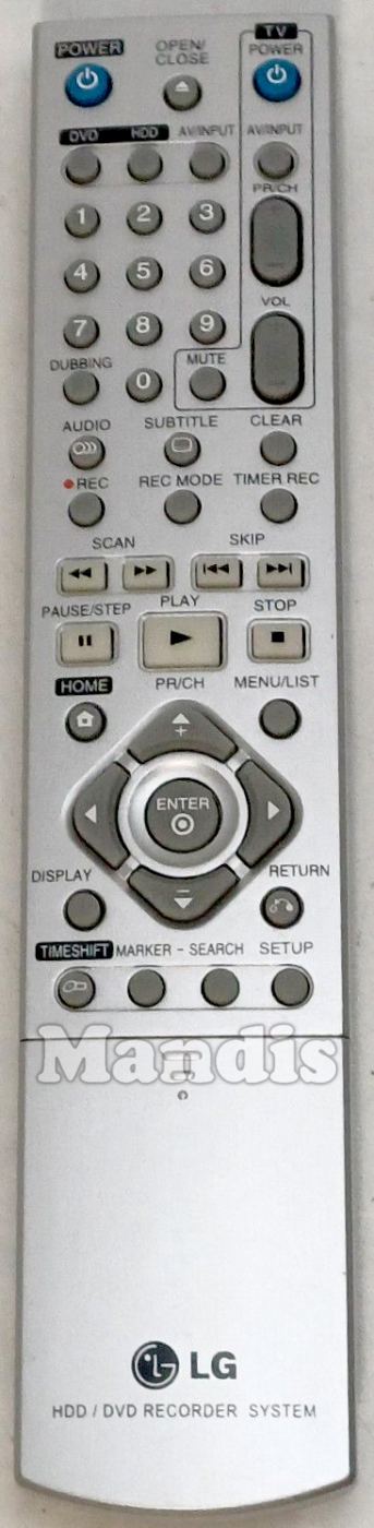 Power, Open / Close, TV Power, TV AV/Input, TV PR/CH+, TV PR/CH-, TV Vol+, TV Vol-, TV Mute, DVD, HDD, AV/Input, 1, 2, 3, 4, 5, 6, 7, 8, 9, 0, Dubbing, Audio, Subtitle, Clear, Rec, Rec Mode, Timer Rec, << Scan, Scan >>, I<< Skip, Skip >>I, Pause / Step, Play, Stop, Home, Menu / List, Up / PR/CH+, Down / PR/CH-, Right, Left, Enter, Display, Return, Timeshift, Marker, Search, Setup, PIP, Zoom, Title, CHP ADD, I.Skip, Repeat, A-B, Thumbnail, TV/DVD, Resolution