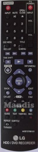Power, Input, Mute, Open/Close, 1, 2, 3, 4, 5, 6, 7, 8, 9, 0, Title/Q.Menu, Disc Menu/Rec List, <<, >>, I<<, >>I, Stop, Play, Pause/Time Shift, Home, Info/Menu, Exit, Back, FAV, CH List, CH/Page+, CH/Page-, Up, Down, Right, Left, Enter, Red, Green, Yellow, Blue, Guide, Text, Timer Rec, Rec, Repeat/Tv/Radio, Subtitle, Power Tv, Input Tv, Vol+ Tv, Vol- Tv, Vol+, Vol-