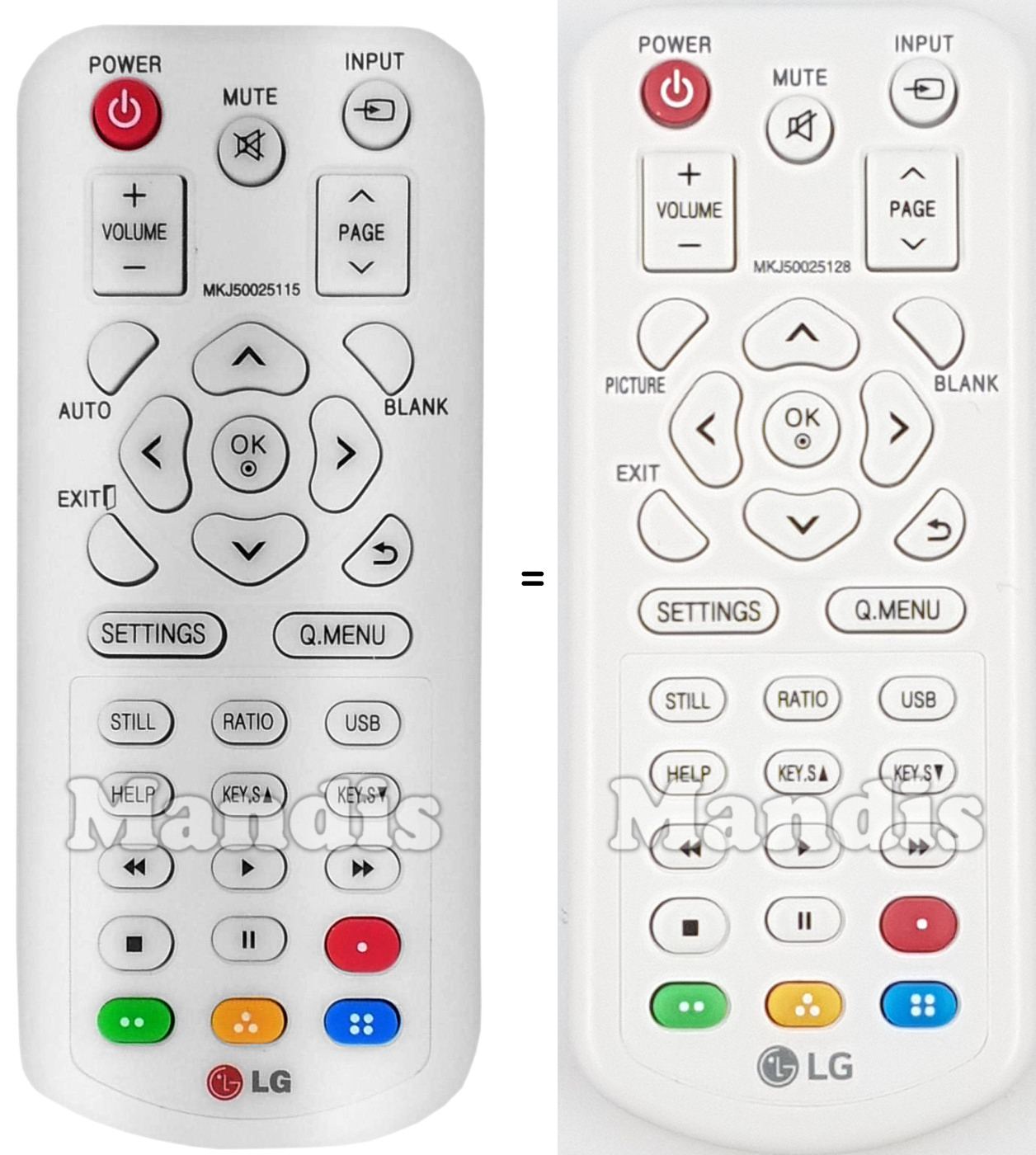 Este controle remoto possui os seguintes botões: Power, Mute, Input, Vol+, Vol-, Page+, Page-, Picture, Blank, Up, Down, Right, Left, OK, Exit, Back, Settings, Q.Menu, Still, Ratio, USB, Help, Key.S/Up, Key.S/Down, <<, Play, >>, Stop, Pause, Red, Green, Yellow, Blue