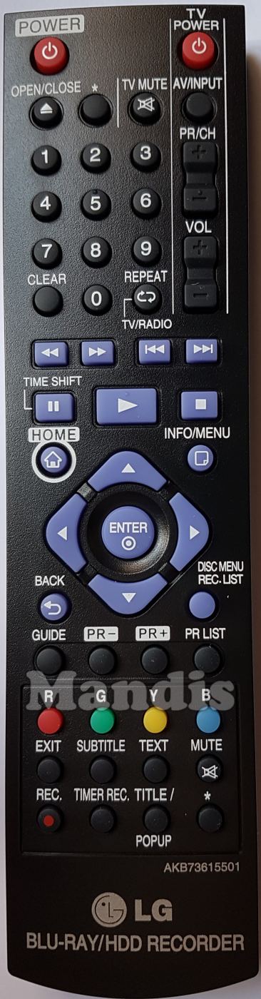 Power, Open / Close, *, 1, 2, 3, 4, 5, 6, 7, 8, 9, 0, Clear, Repeat / TV/Radio, TV Power, TV Mute, TV AV / Input, TV PR/CH +, TV PR/CH -, Vol +, Vol -, <<, >>, I<<, >>I, Pause / Time Shift, Play, Stop, Home, Info / Menu, Up, Right, Down, Left, Enter, Back, Disc Menu / Rec. List, Guide, PR -, PR +, PR List, Red / R, Green / G, Yellow / Y, Blue / B, Exit, Subtitle, Text, Mute, Rec., Timer Rec., Title / PopUp, *