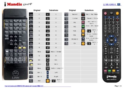 Este controle remoto executa todas as funções do controle remoto original: - Tuner/TV, + Tuner/TV, Preset Tuner/TV, Scan Tuner/TV, Tune Tuner/TV, Band Tuner/TV, Signal Tuner/TV, Store Tuner/TV, Mono/Narrow Tuner/TV, I<< Skip CD/VCR/TAPE, Skip >>I CD/VCR/TAPE, Open CD/VCR/TAPE, << Search CD/VCR/TAPE, Search >> CD/VCR/TAPE, Play CD/VCR/TAPE, < Index CD/VCR/TAPE, Index > CD/VCR/TAPE, Pause CD/VCR/TAPE, Display CD/VCR/TAPE, Repeat CD/VCR/TAPE, Stop CD/VCR/TAPE, 1, 2, 3, 4, 5, 6, 7, 8, 9, 0, On/Off KNEKT, Where KNEKT, What KNEKT, ? KNEKT, DO KNEKT, ◴ KNEKT, :⋮: KNEKT, :⋮: KNEKT, Mute PREAMP, Vol- PREAMP, Vol+ PREAMP, L Bal PREAMP, R Bal PREAMP, Mono PREAMP, AUX PREAMP, Record PREAMP, Listen PREAMP, TP 1 PREAMP, TP 2 PREAMP, TUN PREAMP, PH 1 PREAMP, PH/AUX 2 PREAMP, CD PREAMP