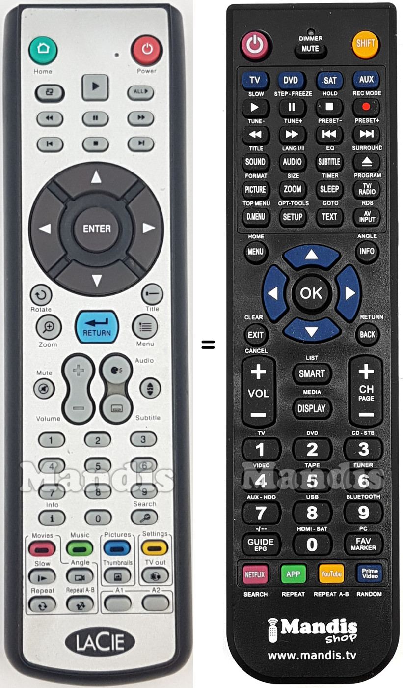 Abaixo, mostraremos a correspondência entre cada botão no controle remoto original e o botão que executa a mesma função no controle remoto de substituição. Em alguns casos, pode ser necessário pressionar a tecla SHIFT antes de pressionar outro botão para realizar determinadas ações. Essas funções adicionais geralmente não são amplamente utilizadas e são incluídas para facilitar o entendimento do controle remoto de substituição, ou porque o controle remoto original tem mais botões do que seu equivalente.
