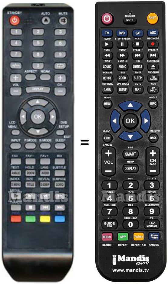 Abaixo, mostraremos a correspondência entre cada botão no controle remoto original e o botão que executa a mesma função no controle remoto de substituição. Em alguns casos, pode ser necessário pressionar a tecla SHIFT antes de pressionar outro botão para realizar determinadas ações. Essas funções adicionais geralmente não são amplamente utilizadas e são incluídas para facilitar o entendimento do controle remoto de substituição, ou porque o controle remoto original tem mais botões do que seu equivalente.