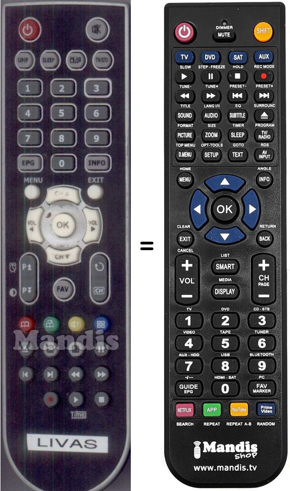 Comando à distância que substitui o original Livas001 em todas as suas funções.