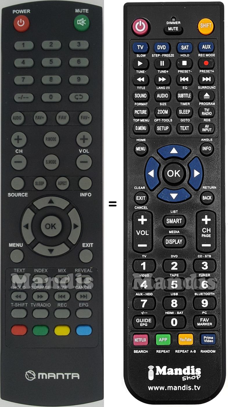 Abaixo, mostraremos a correspondência entre cada botão no controle remoto original e o botão que executa a mesma função no controle remoto de substituição. Em alguns casos, pode ser necessário pressionar a tecla SHIFT antes de pressionar outro botão para realizar determinadas ações. Essas funções adicionais geralmente não são amplamente utilizadas e são incluídas para facilitar o entendimento do controle remoto de substituição, ou porque o controle remoto original tem mais botões do que seu equivalente.