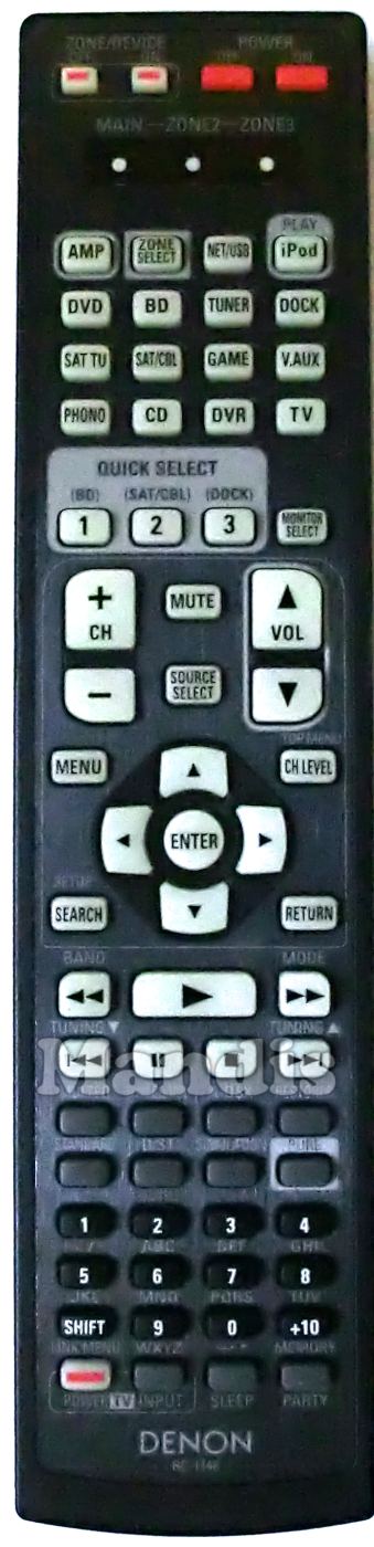Este controle remoto possui os seguintes botões: Zone Device Off, Zone Device On, Power Off, Power On, Net/USB, DVD, BD, Tuner, Dock, SAT TU, SAT/CBL, Game, V.AUX, Phono, CD, DVR, TV, Quick Select 1/BD, Quick Select 2/(SAT/CBL), Quick Select 3/Dock, Monitor Select, CH+, CH-, Vol+, Vol-, Mute, Source Select, Menu, CH Level/Top Menu, Up, Down, Left, Right, Enter, Search/Setup, Return, <</Band, Play, >>/Mode, I<</Tuning▼, Pause, Stop, >>I/Tuning▲, Multeq, DYN EQ/VOL, A-DSX, Restorer, Standard, D/ST, Simulation, Pure, 1, 2, 3, 4, 5, 6, 7, 8, 9, 0, +10, Link Menu/Power Tv, TV Input, Sleep, Memory/Party, iPod Play, Shift