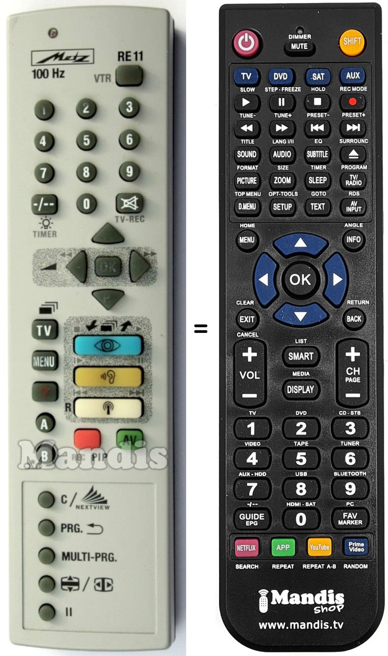Comando à distância que substitui o original RE 11 (600RE1167KD) em todas as suas funções.